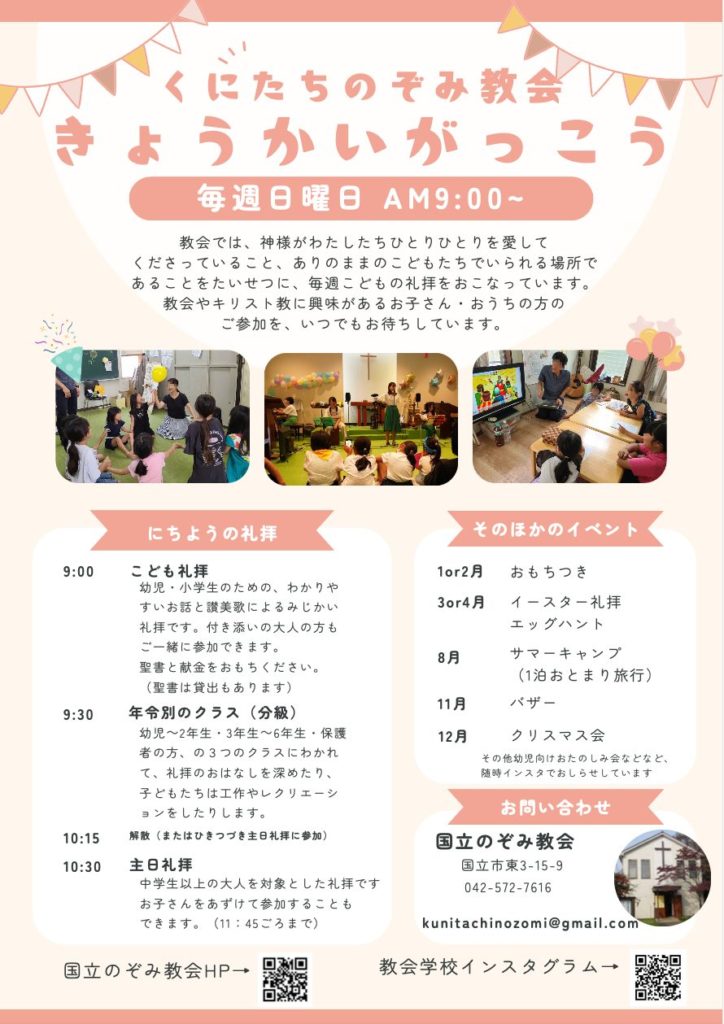 それでももう一度、「のぞみ教会の教会学校」を地域の方々に知ってもらいたいと願い、新しく「教会学校案内」を作りました。22日のバザーで配布を予定しています。また、東小金井教会で行われたように、子どものいるご家庭へのポスティングにも挑戦してみようと考えています。